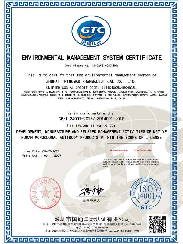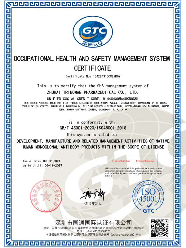 In Sep. 2024, Trinomab successfully obtained the dual certification of ISO14001 and ISO45001 for its manufacturing qualifications.